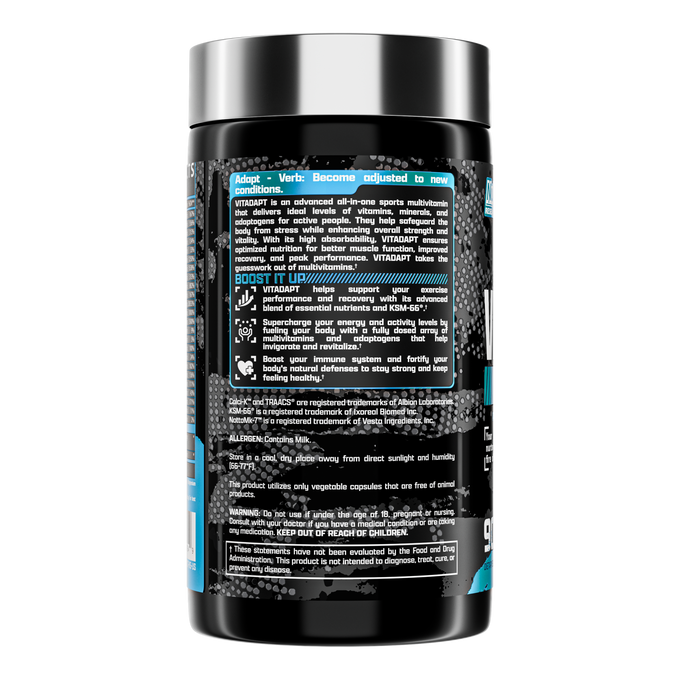 Optimize performance, recovery, and wellness with VITADAPT®, the ultimate high-potency multivitamin/mineral complex built specifically for athletes and serious gym warriors. Unlike generic drugstore multis, VITADAPT delivers clinically effective doses of 24 premium vitamins, chelated minerals, and patented adaptogens in one convenient serving – designed to fill nutritional gaps, reduce stress, boost immunity, and keep you performing at peak levels year-round.
